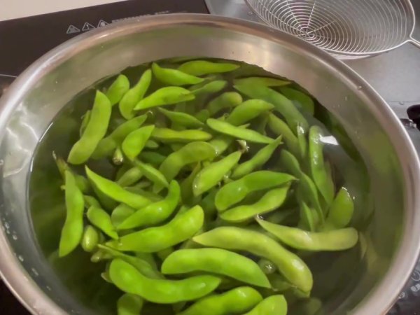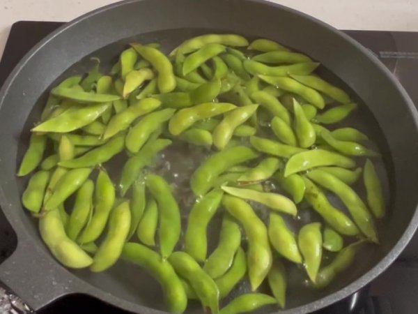 フライパンや鍋に湯を沸かし、沸騰したら枝豆を入れます。1分ほどゆでたら冷水にとって冷まします。※ここで中の豆まで完全に火を通してしまうと旨味や風味が出てしまうので、皮だけに火が通るように短くゆでます。皮に火が通ると生のままより剥きやすくなります。