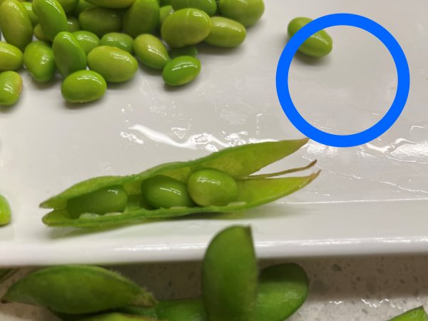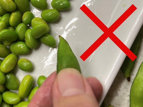 枝豆が触れるくらいに冷めたら皮をむいて中の豆を取り出します。豆を取り出す時のポイントは、爪などで広げ、さやを開けて出すことです。枝豆をそのまま食べるときのように、さやをつぶすように押し出すと、豆が飛び出して遠くへいってしまいがちなので、さやを開ける方法が確実です。