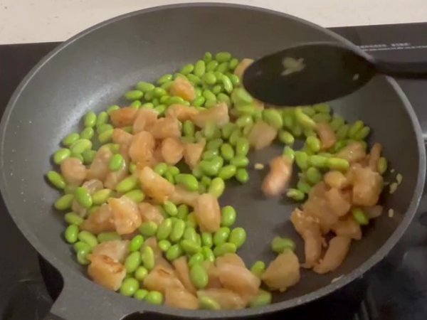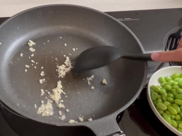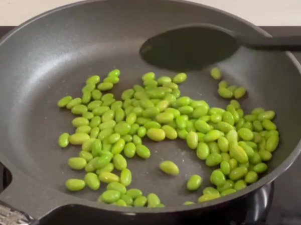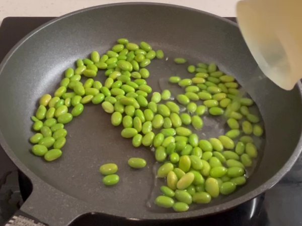 フライパンに油大さじ1/2、枝豆を入れ中火にかけます。フライパンが熱くなり、枝豆全体に油が回ったら水大さじ4(60cc)を注ぎ蓋をして5分蒸し煮にします。※水がなくなりそうなら適宜追加します。5分経って豆が硬ければ1~2分追加で蒸し煮してください。